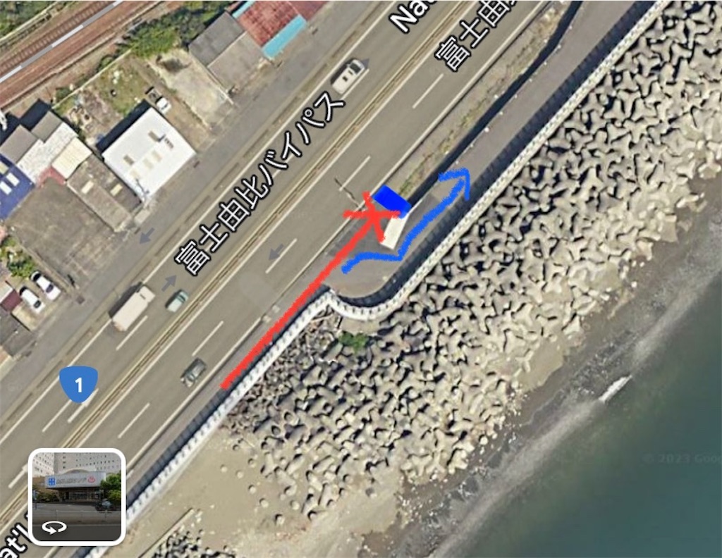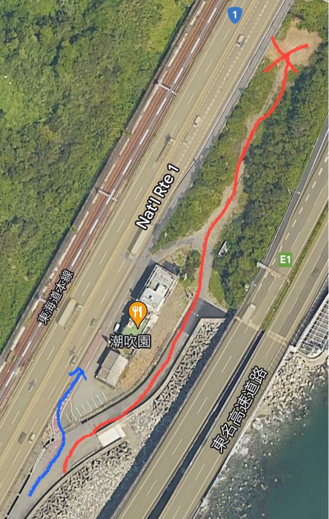 はい、ここも罠でした。東京側から来ると気付かないのですが、静岡側から来た時は、青い線のように細い通路から行かないといけないのです。ここも夜は暗くてわかりづらいので、誘導となる明かりなど設置して欲しいものです > 静岡県。