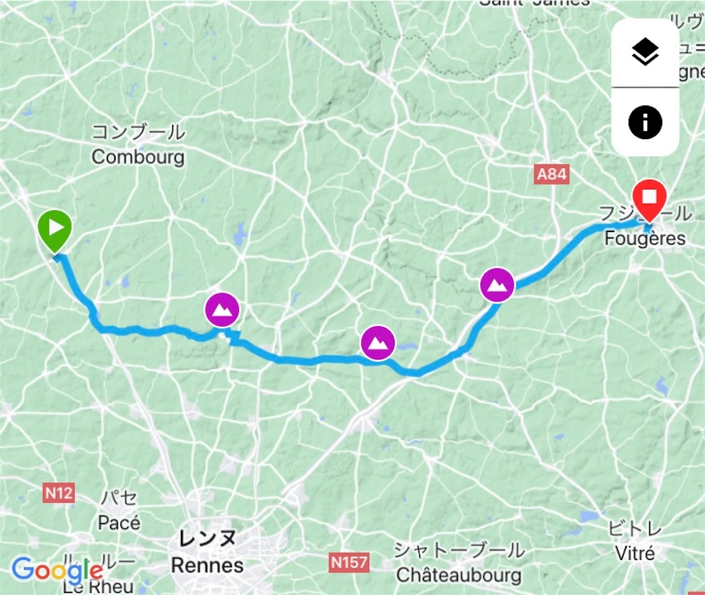 19:50 Saint-Aubin-du-Cormier (サン=トーバン=デュ=コルミエ) に入った。916km地点。