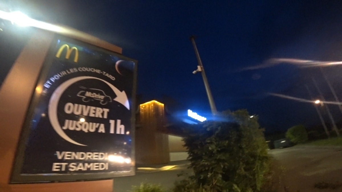 21:42 フジェールに向かう途中、キラリと輝く黄色い明かりが目に入った。初見なら見逃したかも知れないけれど、往路を通った際に見ている。あれは、あの輝く M マークはマクドナルドだ!